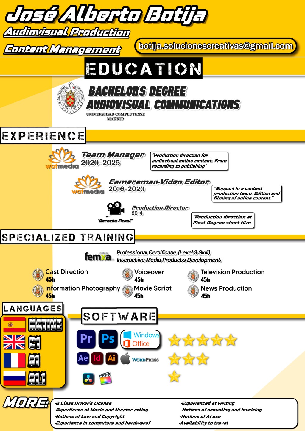 - Adobe InDesign. Adobe After Effects. Adobe Illustrator. WordPress. High Level.